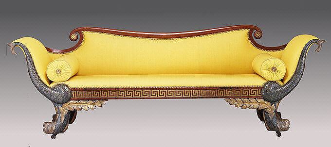 This sofa exhibits a highly sophisticated blend of line, detailed carving, and subtle color. The carved vert antique legs in the shape of dolphins are found on other sofas of the period and relate to maritime talismans. Traditionally, in Greek myth, dolphins aided shipwrecked sailors.