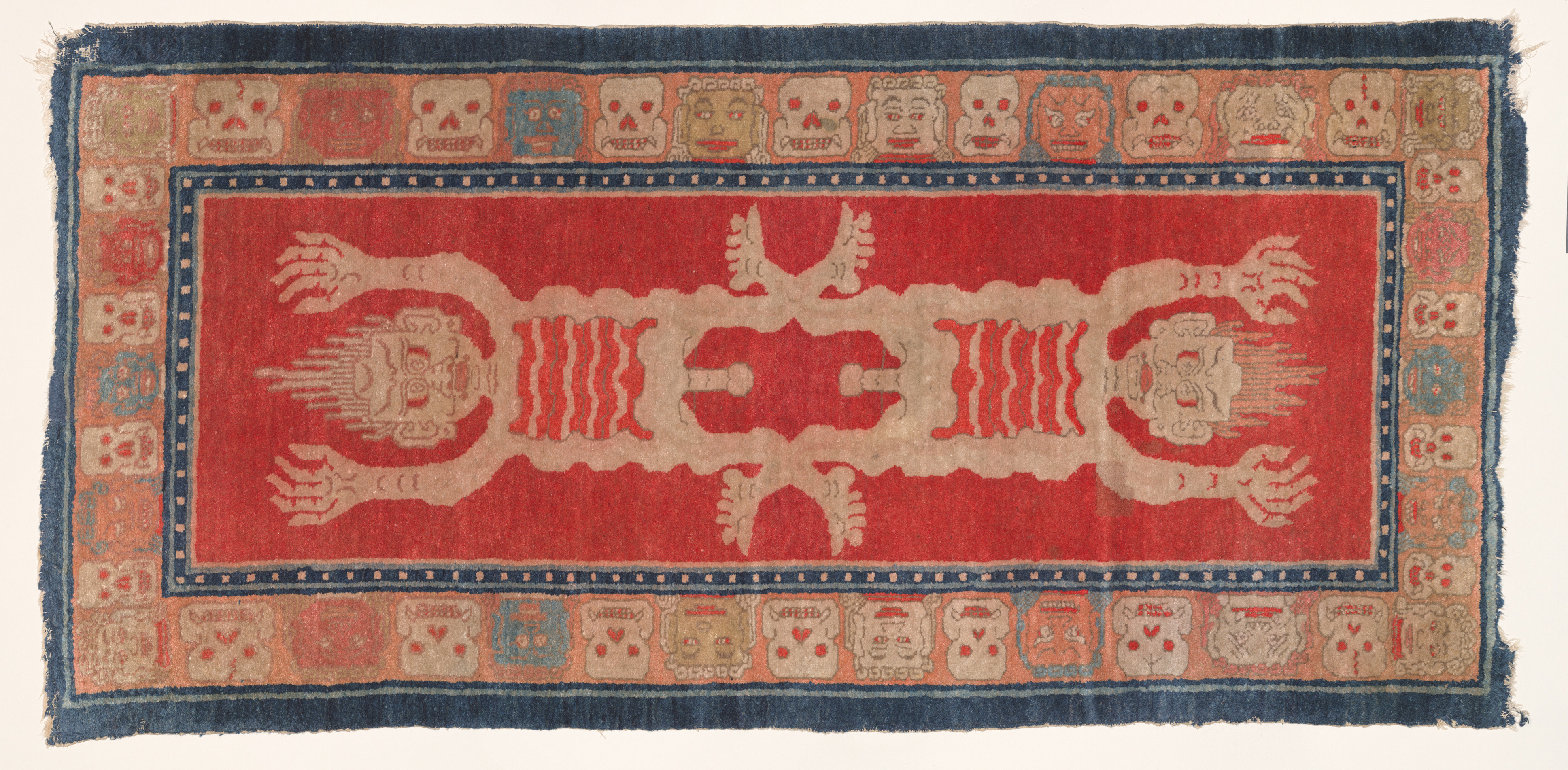 Woolen rugs form an important part of Tibetan material culture, serving as floor coverings on beaten earth floors for warmth, and as saddle blankets for riding. They also provide the setting for some of the most dramatic imagery in Tibetan art. The design of flayed male figures forms part of the paraphernalia employed to invoke protective deities. Such rugs feature in the annual New Year’s Eve exorcism dance performance (Tse Gutor, rtse dgu gtor), performed by masked dancers to cleanse the past year’s sins in preparation for the new.