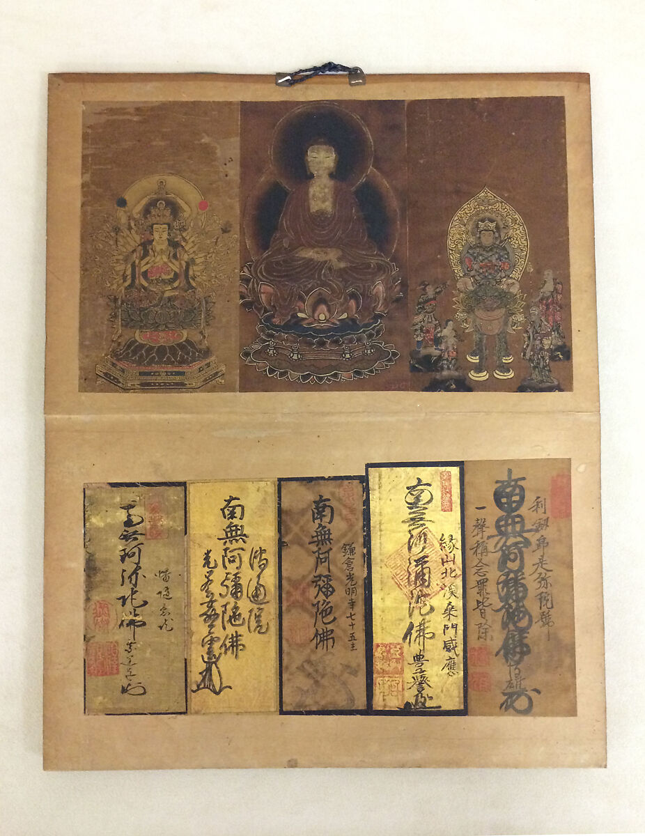 An adherent of the Pure Land School of Buddhism compiled the content of these albums—slips of paper brushed with the name of the Buddha Amida (Sanskrit: Amitābha)—on temple visits. The signed and sealed slips indicate that most of the calligraphers were abbots of Pure Land temples in the greater Edo (Tokyo) area. The albums also have paintings of Amida, as well as Shandao, an influential Tang dynasty (618–907) monk; Hōnen, the founder of the Pure Land School in Japan; and a youthful Shinran, the founder of the True Pure Land School. A portrait of the monk Yūten Kenyo (1637–1718), who served as the thirty-sixth abbot of the Edo temple Zōjōji, appears on the right-hand side of a page of one album. Yūten was born in the south of what is now Fukushima Prefecture, and entered Zōjōji as a novice at the age of twelve. He struggled in the academic environment there and left, but later, a dream encounter with the deity Fudō Myōo (Sanskrit: Achala Vidyārāja) is said to have led to a personal transformation, following which he became famous for his ability to ensure birth in the Pure Land for those afflicted by tormented human spirits (onryō).