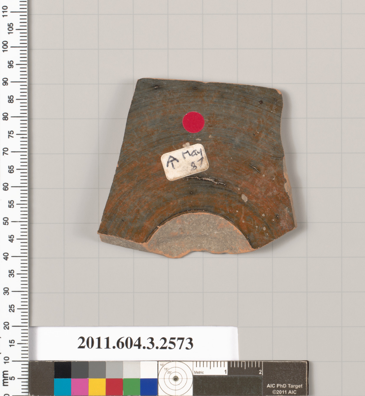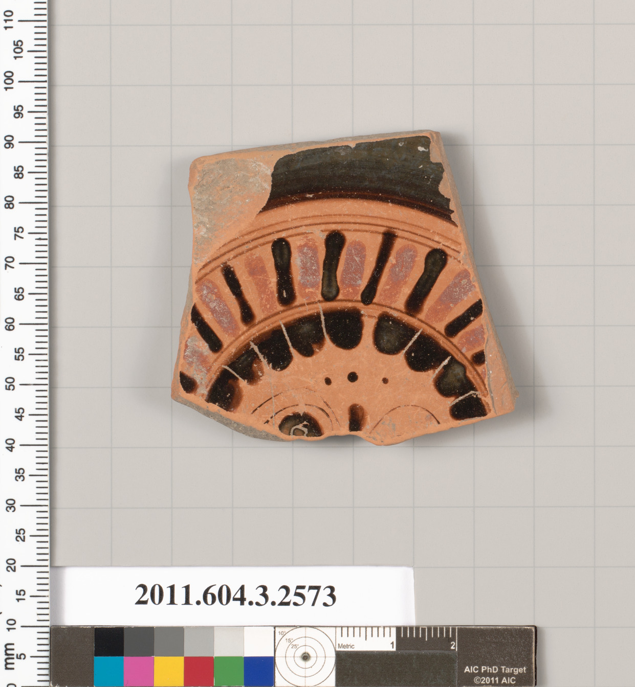 Interior, part of the hair, forehead, eyebrows, top of the nose, and part of the left eye of a gorgoneion; framing the gorgoneion, a band of tongues, alternating with red and black