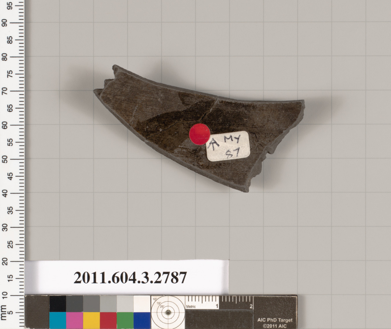 At the left, dots from the panel ornament; part of the upper torso of a draped woman to right, with her right arm bent (maenad?); in the field, part of a vine