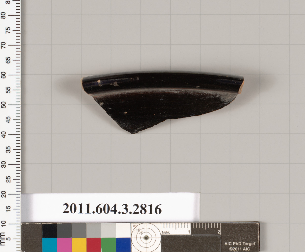 Black glazed fragment from a dish, with a reserved line on the top side of the rim