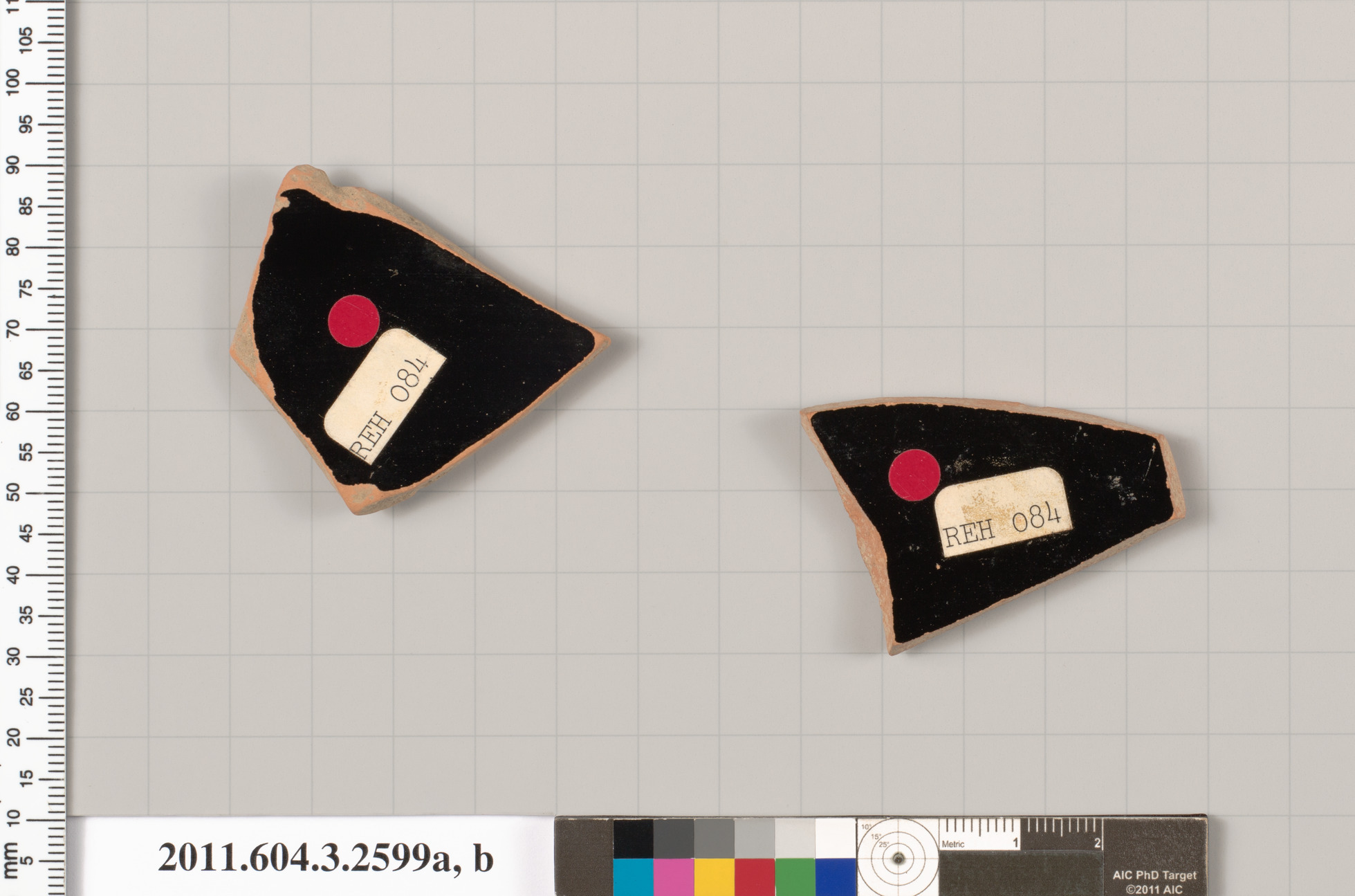 Exterior, one fragment has the head and part of the upper torso of a bearded hunter to right, wearing a cap, chitoniskos and a nebris, with a spear; bearded hunter to right wearing a cap and a chitoniskos with red dots, with his arms bent and his hands above his hips; in the field, letters; a second fragment has the tail and hind legs of a dog to right; behind the dog, part of a calf and foot of a male to right; head, neck, and part of the right arm of a bearded man who is face down on the ground; part of the mouth, neck, and left foreleg of the Caledonian boar to left; Caledonian boar hunt