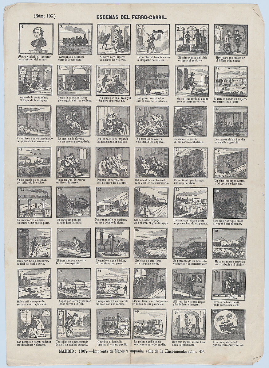 - Title: Broadside with 48 scenes of trains and their passengers etc