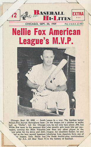 From Nu-Card Baseball Hi-Lites series (W460). Format of a newspaper headline with an individual player photo and story below. Oversized. Black and white with red "headlines". Card is numbered at top left. "Extra" in red at top right, "Baseball Hi-Lites" title (printed in black and red). Each card includes place, month, day, and year of featured "story". Back includes a baseball quiz.