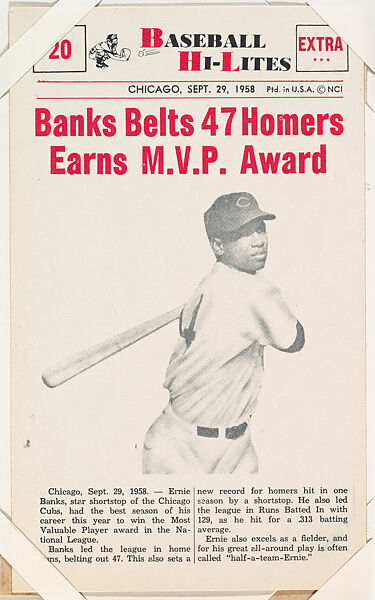 - Title:Ernie Banks #20 from Nu-Card Baseball Hi-Lites series (W460)