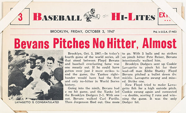 From Nu-Card Baseball Hi-Lites series (W460). Format of a newspaper headline with an individual player photo and story below. Oversized. Black and white with red "headlines". Card is numbered at top left. "Extra" in red at top right, "Baseball Hi-Lites" title (printed in black and red). Each card includes place, month, day, and year of featured "story". Back includes a baseball quiz.