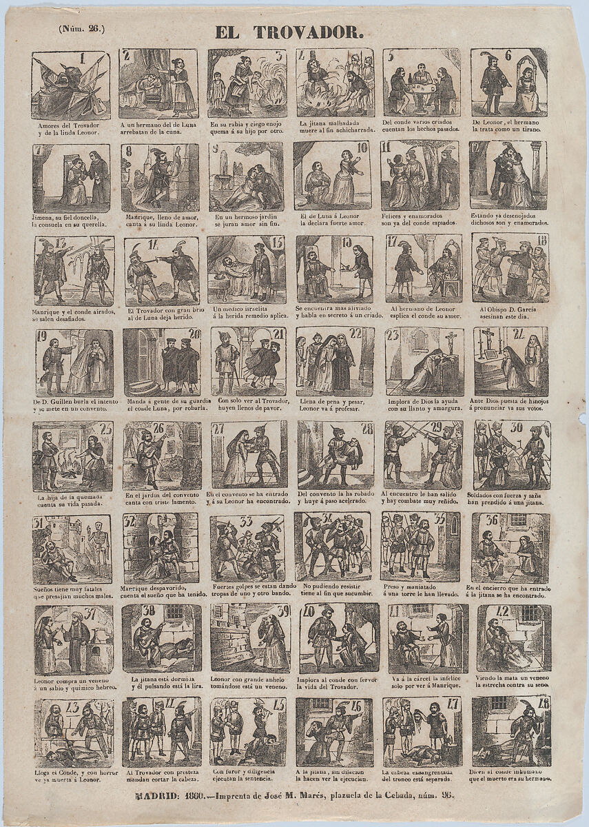 - Title: Broadside with 48 scenes relating to the life of a troubadour
