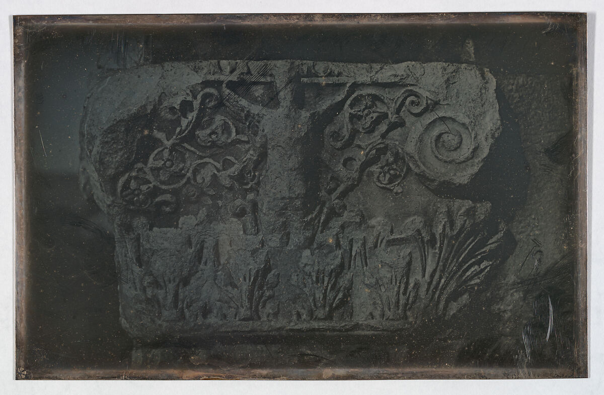 In 1842, the artist, archaeologist, and pioneer photographer Girault de Prangey embarked on a three-year photographic excursion around the eastern Mediterranean to study the origins of Islamic architecture. He returned to France in 1845 with at least 1,000 daguerreotypes, including this sculptural detail from a pillar near the theater of the ancient Greek city of Miletus in Turkey. The Neried, or se nymph, is indicative of the importance and proximity of the Mediterranean Sea.