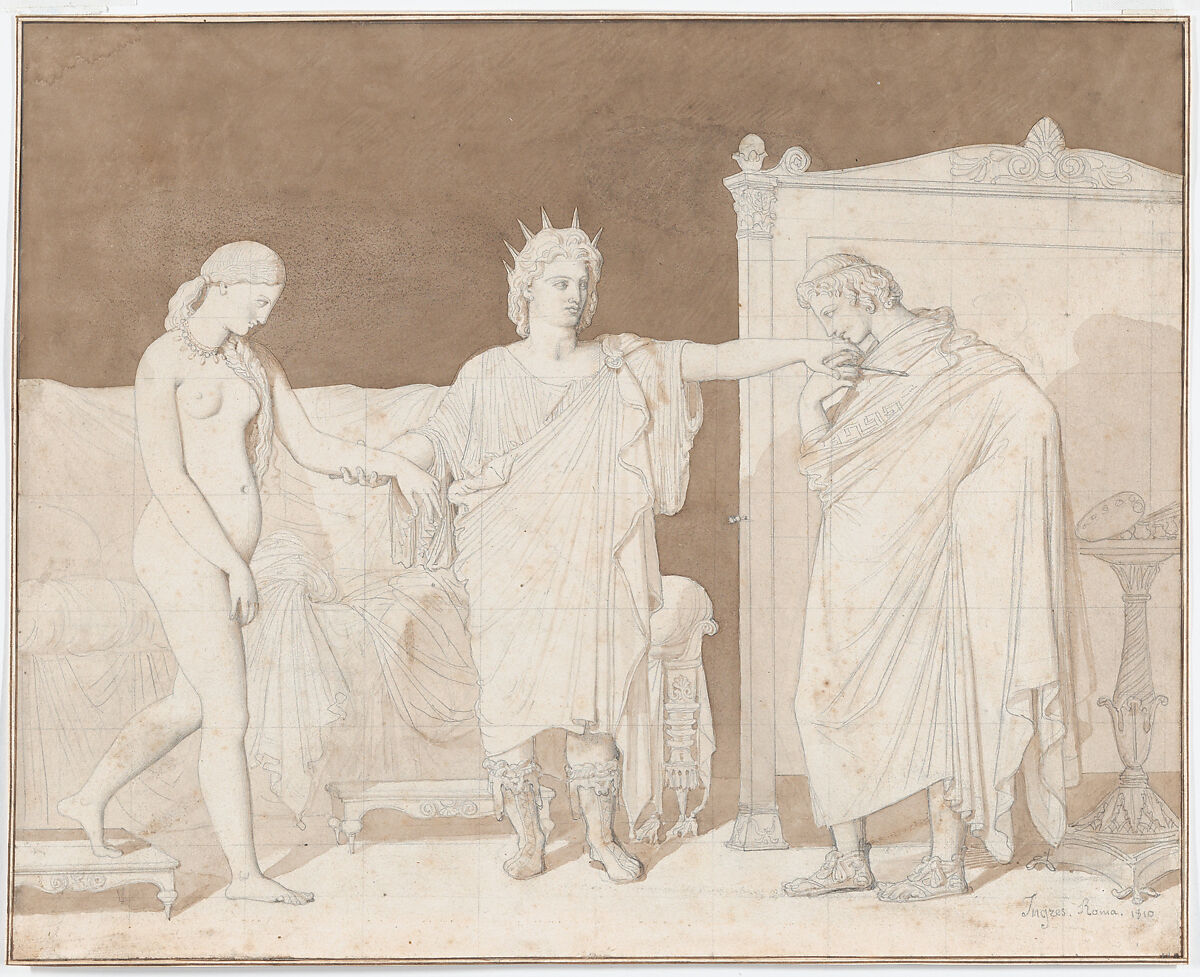 In this drawing, which dates to Ingres’s last year as a student at the Académie de France in Rome, Alexander the Great (at center) offers his favorite mistress, Campaspe, to Apelles, the painter from whom he had commissioned her portrait. According to the narrative from Pliny’s "Natural History," over the course of the sittings, the painter had fallen in love with his subject, prompting Alexander to present Campaspe to him as a sign of his esteem. Adopting a friezelike composition suited to the classical subject matter, Ingres achieved the crisp contours of the figures by cutting the composition in silhouette and pasting it onto brown-washed paper. Ingres never pursued the subject in paint and so likely intended this drawing as a finished work.