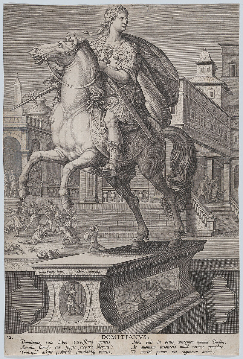 - Title: Plate 12: equestrian statue of Domitian, seen three-quarters to the left, with his stabbing death at right in the background, from 'Roman Emperors on Horseback'