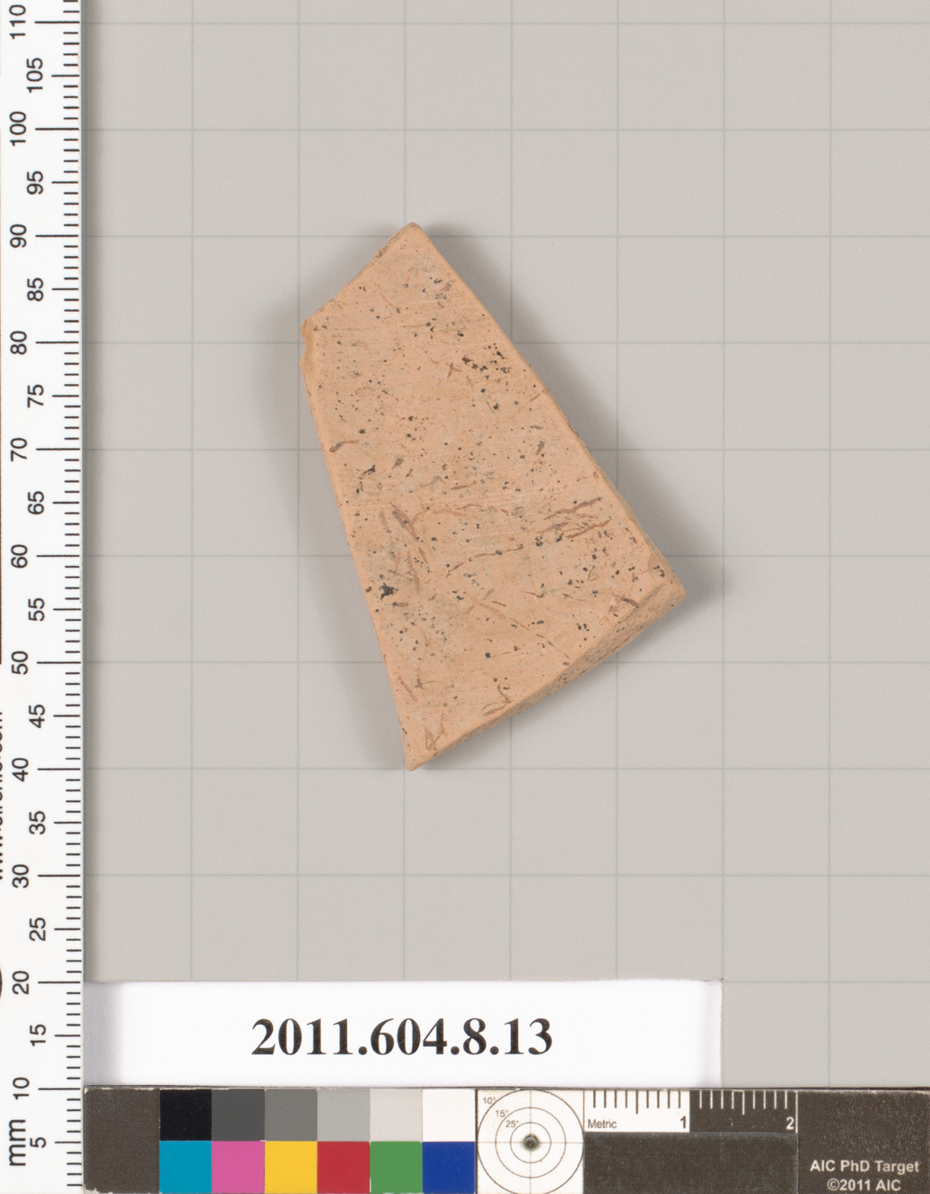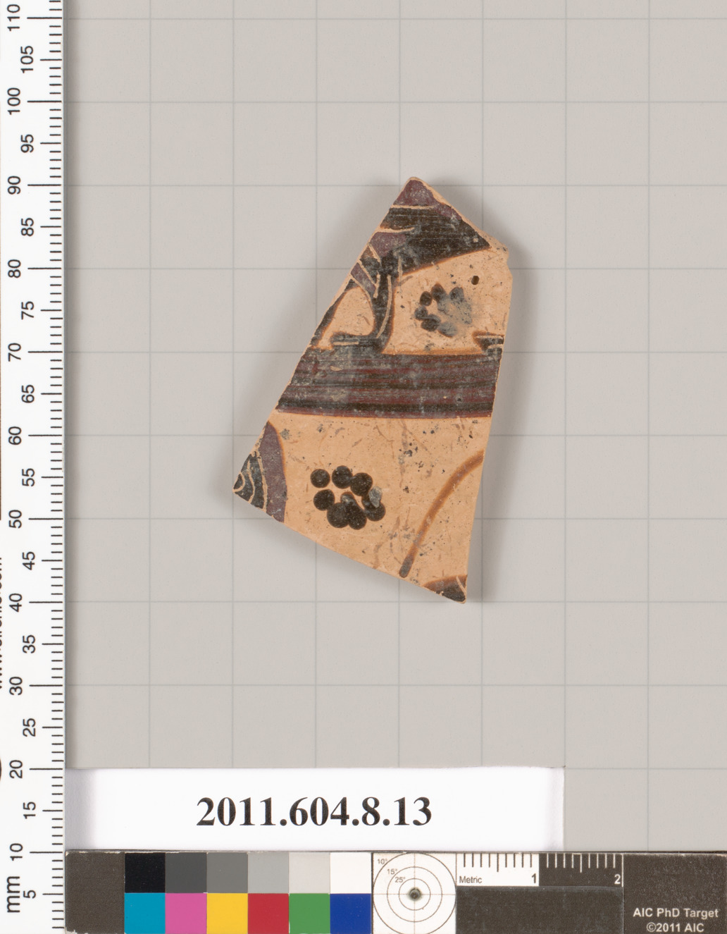 Part of the belly and forelegs of a feline to left; below the belly, a rosette; in the frieze below, at the left, part of an animal?; in the background, a rosette; at the right, part of a tail?