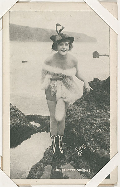 From Mack Sennett Comedies Arcade series (W423). Produced by Mack Sennett Comedies and Evans L.A. Include known actresses of the silent film era. Dispensed in arcade machines. Postcard-sized thick card. The cards in this set are black and white. White border. Blank back. Printed on cards in white: "MACK SENNETT COMEDIES" and "Evans (underlined)/ L.A./ ©" .