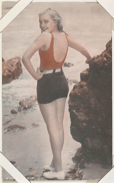 From Actress series (W423). Sold through arcade vending machines. Postcard-sized thick card. Black and white with color additions. Blank back. Printed at lower edge of card, in white: MADE IN U. S .A.