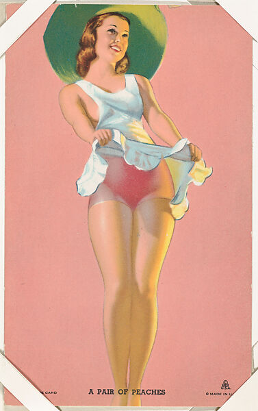 From Hot'Cha Girls series (W424). Published by International Mutoscope Reel Company ca. 1940–45. Sold through arcade vending machines. From a set of 65. Postcard-sized thick card. Full color. Blank back. Earl Moran artist. Printed across bottom of card: A MUTOSCOPE CARD PRINTED IN U. S. A. and ©/ B&B/ U S A..