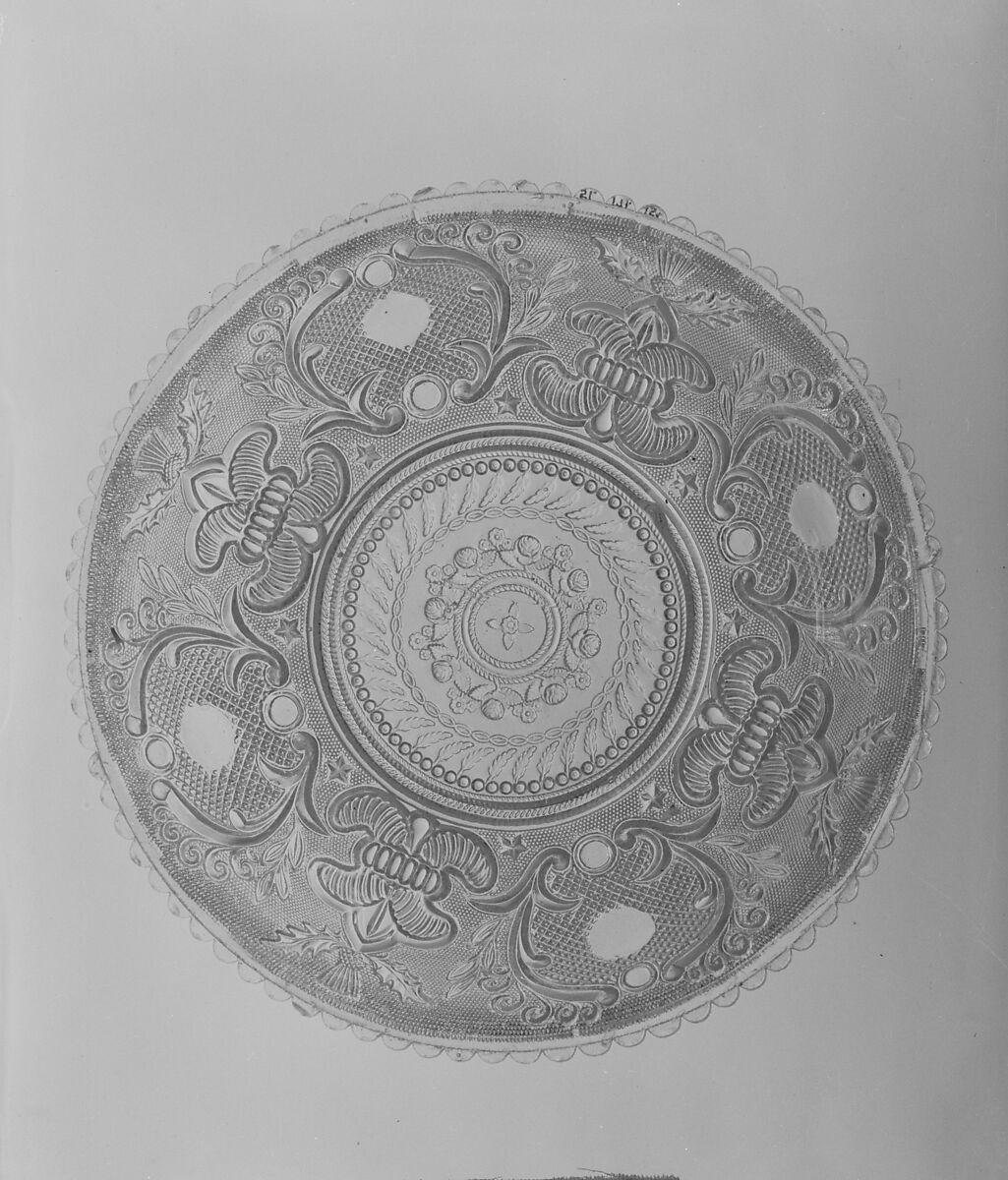 This bowl is pressed in fleur-de-lis and thistle patterns. Although it may be of New England origin, stylistic considerations as well as the slightly dull quality of the glass suggest a possible Pittsburgh or Midwest attribution.