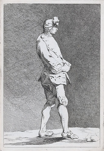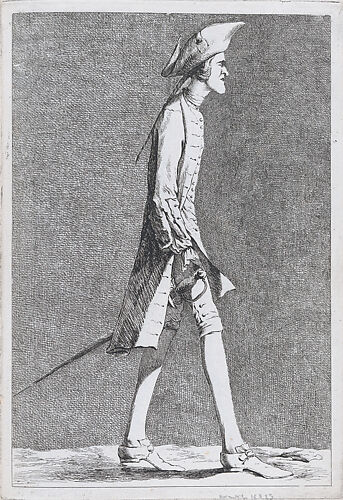 This print is bound in an album made up of sixteen early impressions and one later impression of La Live de Jully's "Recueil de caricatures", etched ca. 1754 after drawings by Jacques François Joseph Saly, eight caricatures etched after Thiemet, and two anonymous prints of a standing man and standing woman.