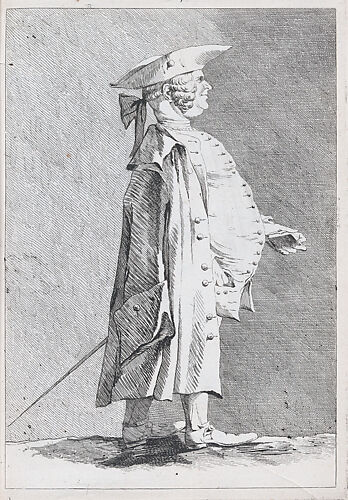 This print is bound in an album made up of sixteen early impressions and one later impression of La Live de Jully's "Recueil de caricatures", etched ca. 1754 after drawings by Jacques François Joseph Saly, eight caricatures etched after Thiemet, and two anonymous prints of a standing man and standing woman.