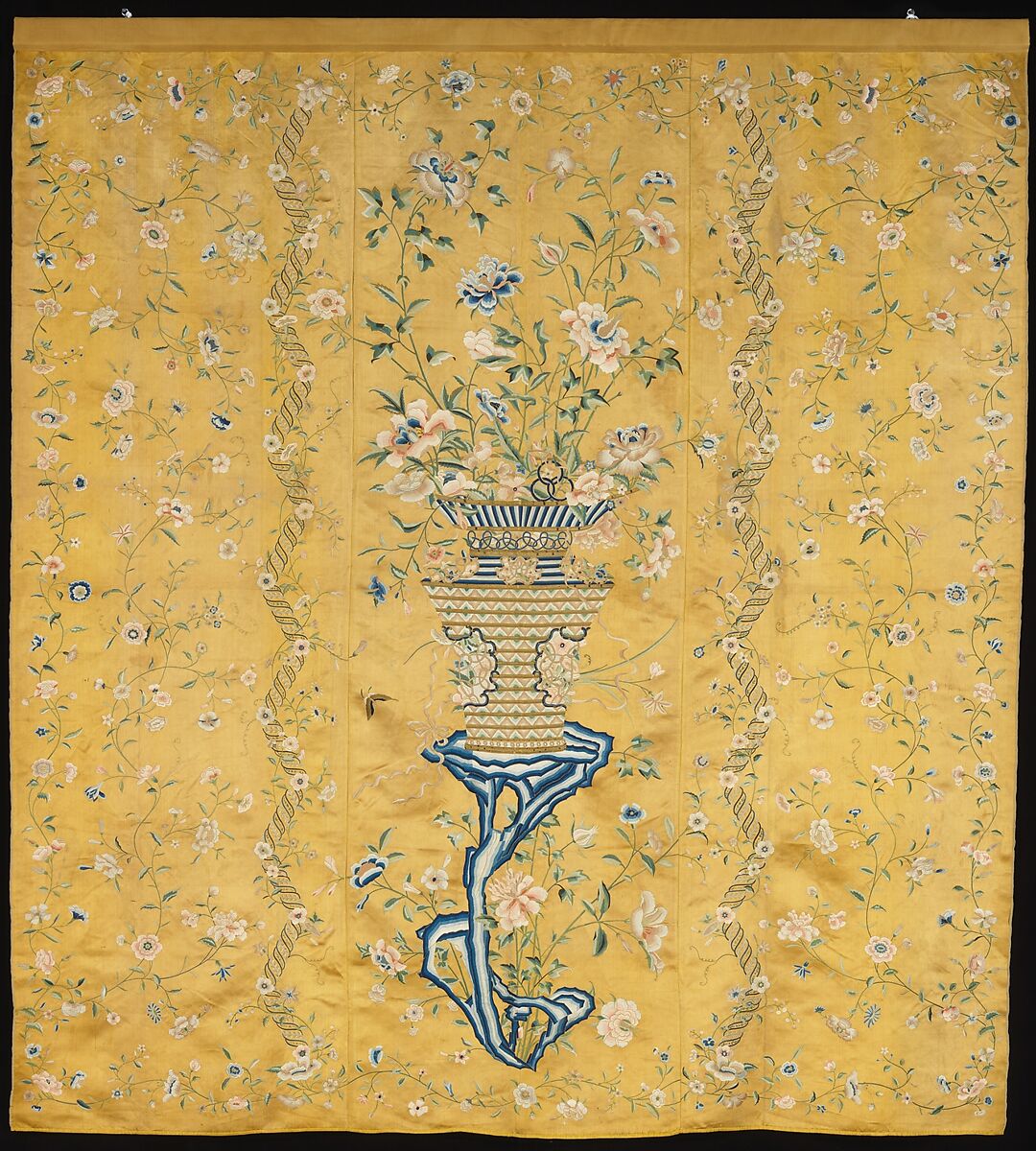 The design of the vibrant flowers on this Chinese hanging marks it as an export for Europe. Unlike typical Chinese flowers, their centers dramatically protrude and contrast sharply with the petals, signaling the influence of Indian export textiles with similar floral forms. However, the container of flowers rests on a distinctly Chinese garden rock, stitched in blue and white. Immaculately finished on both sides, the contrasting yellow selvages visible on the red side mark the yellow as the front. The hanging may have been used as a bed curtain, the red side visible to people inside the bed, while the yellow was exposed to the public eye.