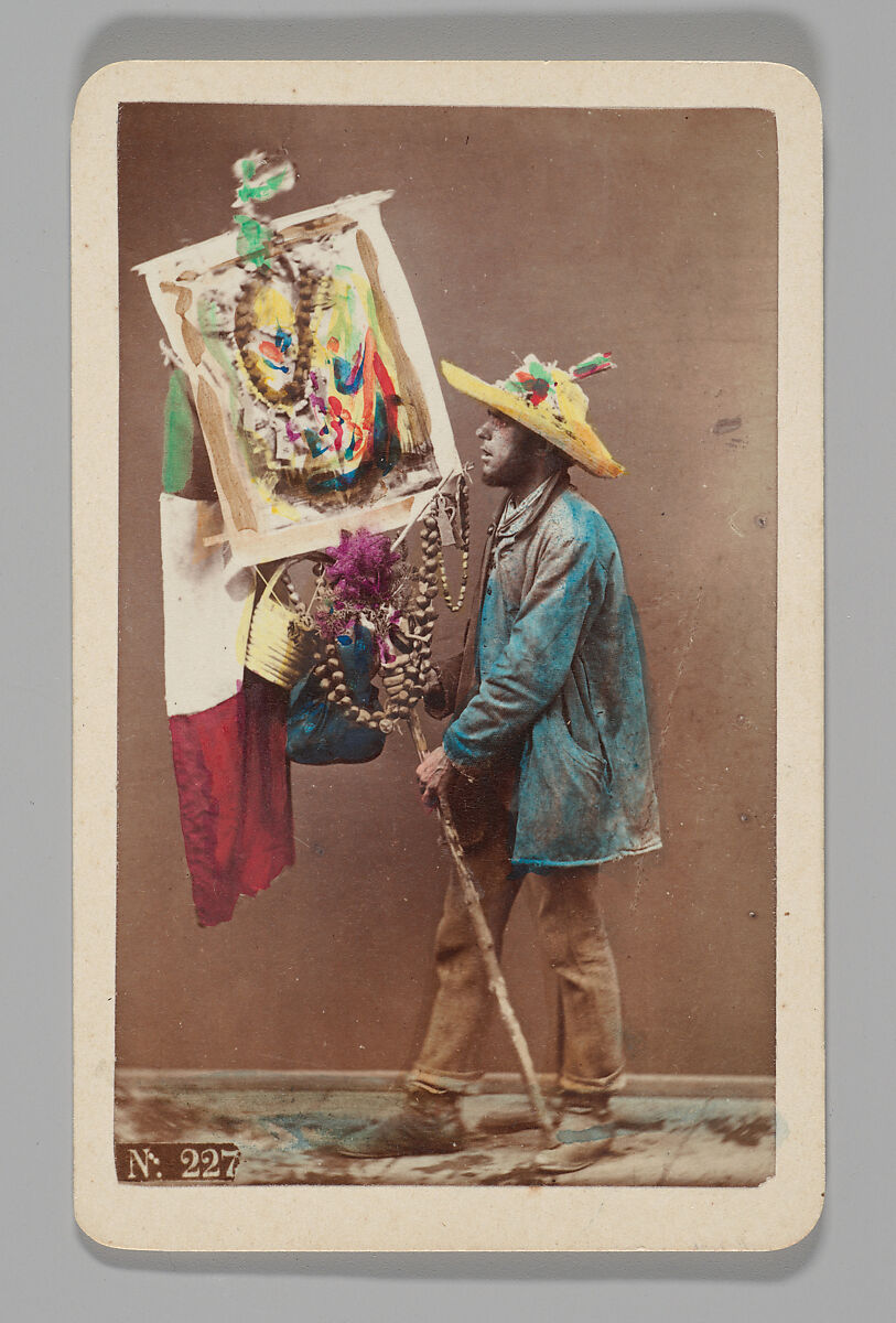 The carte de visite, composed of a print of approximately 2 x 4 inches mounted to card stock, is perhaps the most ubiquitous form of nineteenth-century photography. From the late 1850s through the latter half of the century, these economical keepsakes circulated en masse and spurred a veritable “cartomania.” This is an example of those distributed by the commercial photography studios of Conrad in Naples and Ponti in Venice, depicting occupational “types” related to those cities, such as a hooded member of a religious confraternity, a masked Pulcinella (a stock theater character), a musician, a water carrier, and an oyster shucker, among others. While these stereotypical images charmed tourists interested in foreign customs, they also appealed to a growing clientele of middle-class Italians as a means of reflecting on their own social standing.