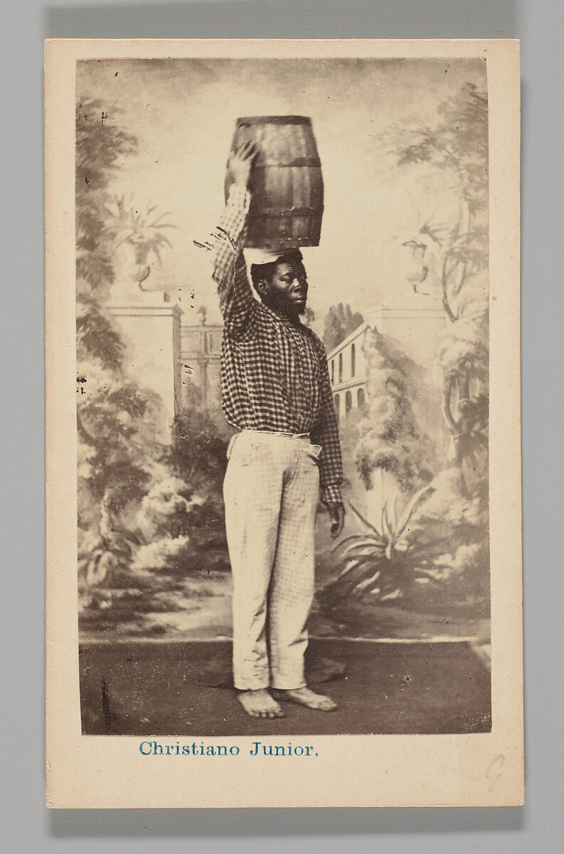 - Title: [Studio Portrait: Male Street Vendor with Barrel on Head, Brazil]