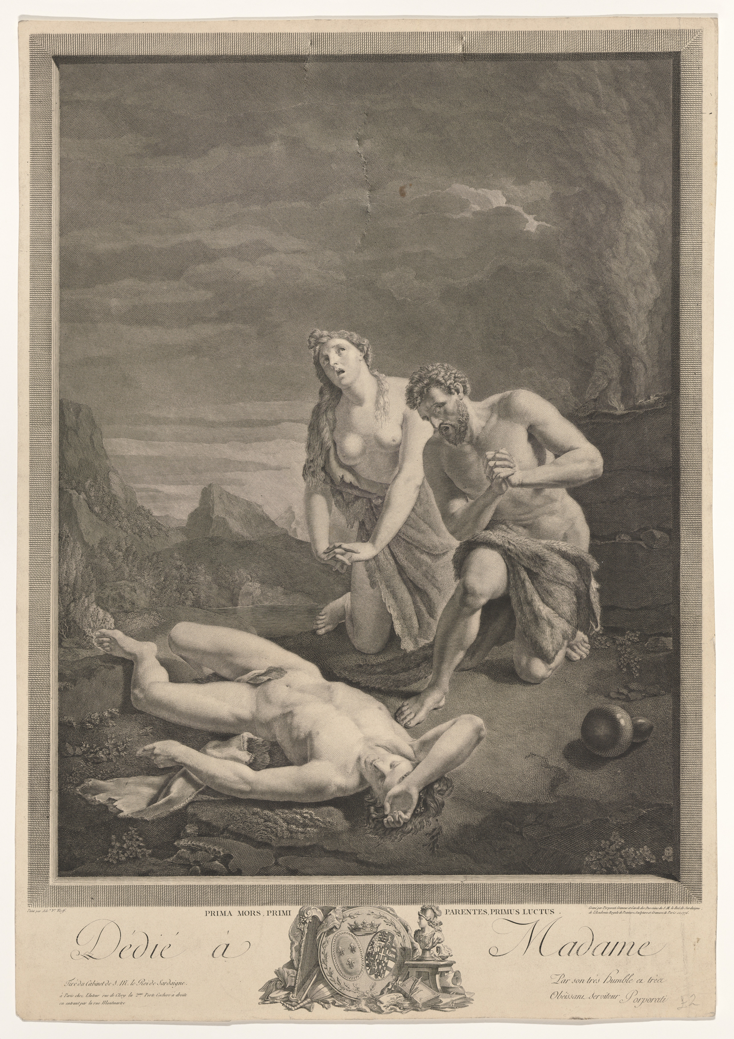 Adam and Eve kneeling at right and lamenting the death of Abel, who is lying in the foreground