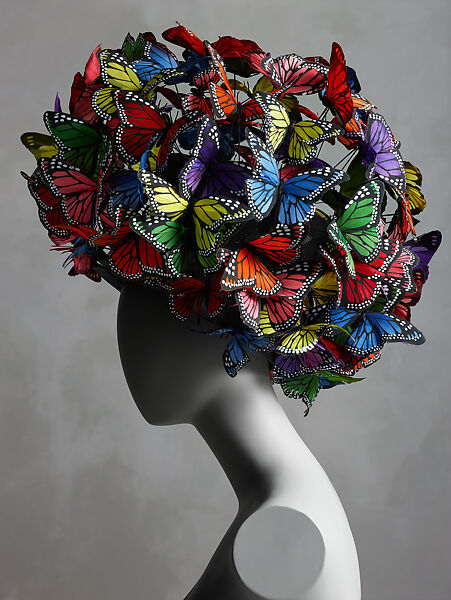 This work of art is currently on loan to the museum.This headpiece by Philip Treacy epitomizes the milliner’s untethered and imaginative approach to design. A swarm of butterflies is assembled from exquisitely worked turkey feathers that were cut, painted, and hand-fashioned into delicate, fluttering forms. Butterflies are one of the most potent symbols of collecting. Rooted in taxidermic systems yet resplendent with poetry, the insect occupies a prominent spot in most European Wunderkammern, or cabinets of curiosities. Because of its transformative nature, the butterfly has inspired infinite metaphor, and within the realm of fashion the analogy has particularly flourished. It easily applies to the accessories designed by Treacy, which invariably hold the potential for dramatic metamorphosis.