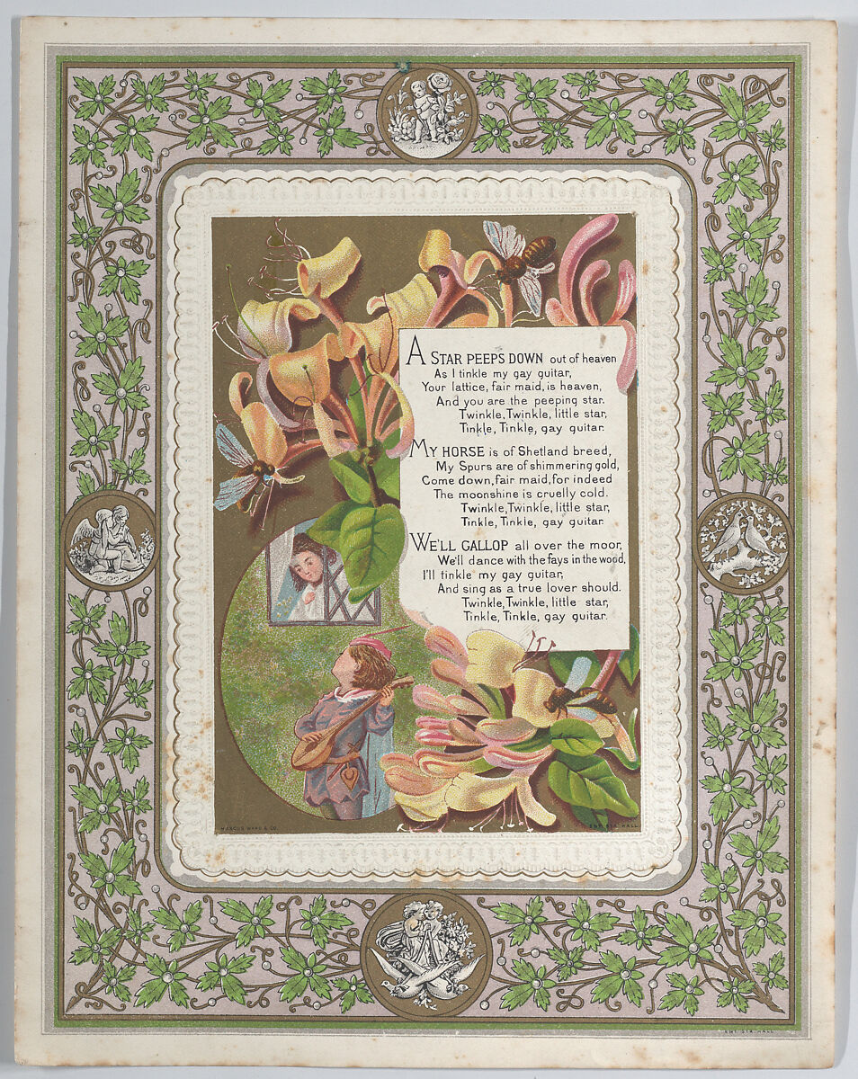 - Medium:White card cameo-embossed, scalloped border, chromolithography, gold lithography