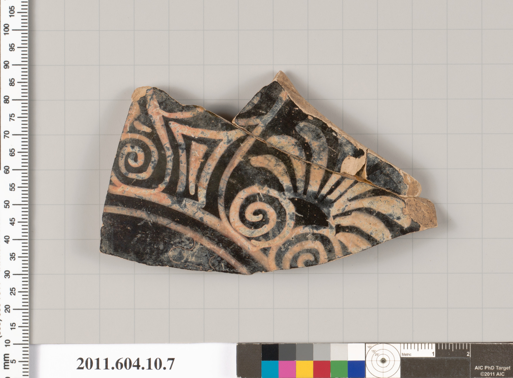 Interior, hand holding a staff?; Exterior, circumscribed palmettes with tendrils