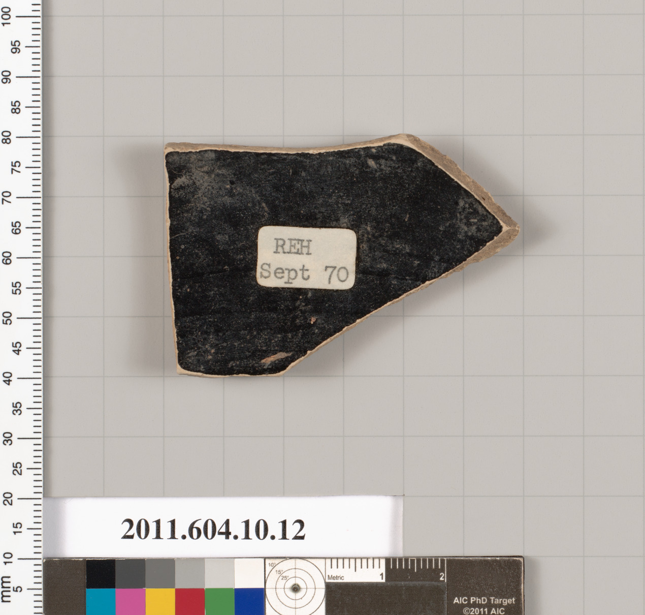 Exterior, part of the frontal torso, bent right arm, and left arm of a youth, holding a fillet in his left hand; bent arm and part of the leg of a figure to left
