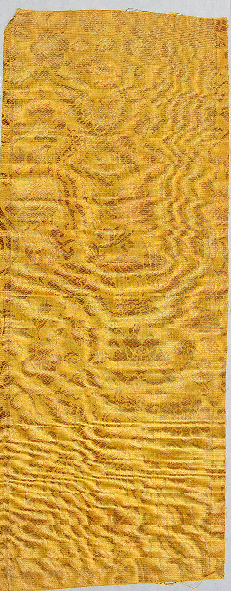 Sutra cover with repeating pattern of phoenixes among flowers; dark metallic thread on a yellow background. Silk gauze with supplementary-weft patterning in (tarnished silver?) metallic thread. This sutra cover lacks its backing board.