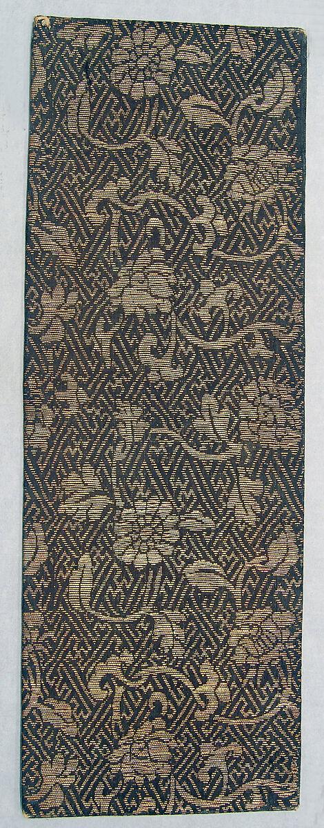 Sutra cover with repeating pattern of various flowers with leaves and scrolling stems on a small-scale overall background of a geometric fret that incorporates the swastika (wan, signifying 10,000); gold metallic thread on a dark blue background. Silk satin with supplementary-weft patterning in metallic thread.
