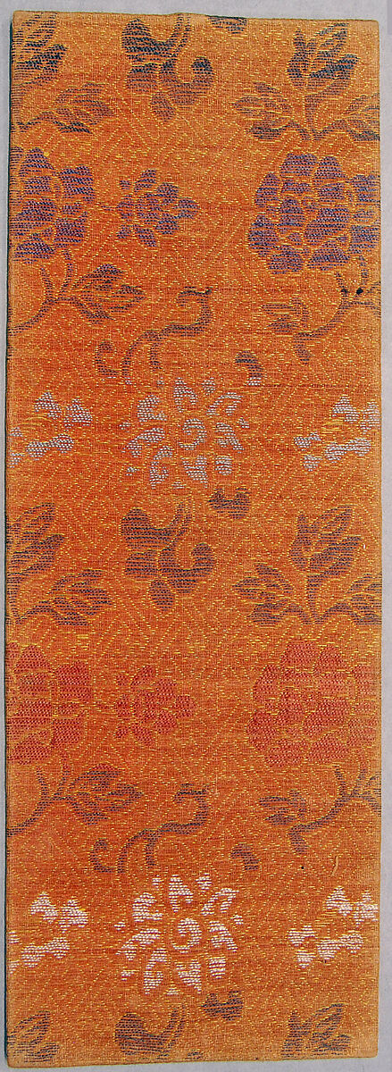 Sutra cover with repeating pattern of alternating rows of peonies and lotus-like flowers accompanied by leaves and stems on a small overall fretwork background that incorporates the swastika (wan, signifying 10,000); shades of blue, white, red, and yellow on a red-orange background. Silk satin with supplementary-weft patterning in silk.