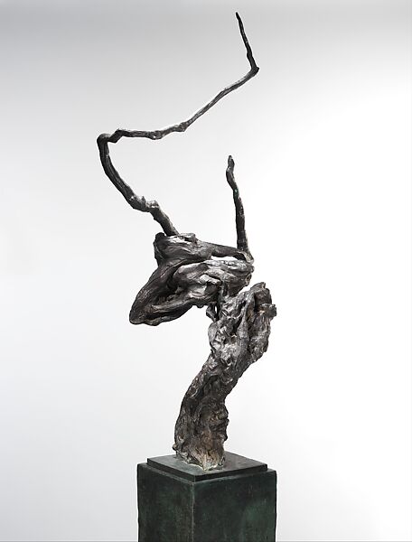 Primarily known as an oil painter, this bronze sculpture represents a new direction in Zeng’s practice. Untitled evokes the gnarled texture and convoluted form of a blasted tree trunk that continues to send forth new shoots. The twisted and bent “trunk,” scarred with knotholes and cracks, suggests a harsh environment and punishing forces, but the upward reaching “branches” convey a sense of endurance and resilience reminiscent of traditional paintings of ancient plum trees—an abiding symbol of survival, renewal, and moral purity.