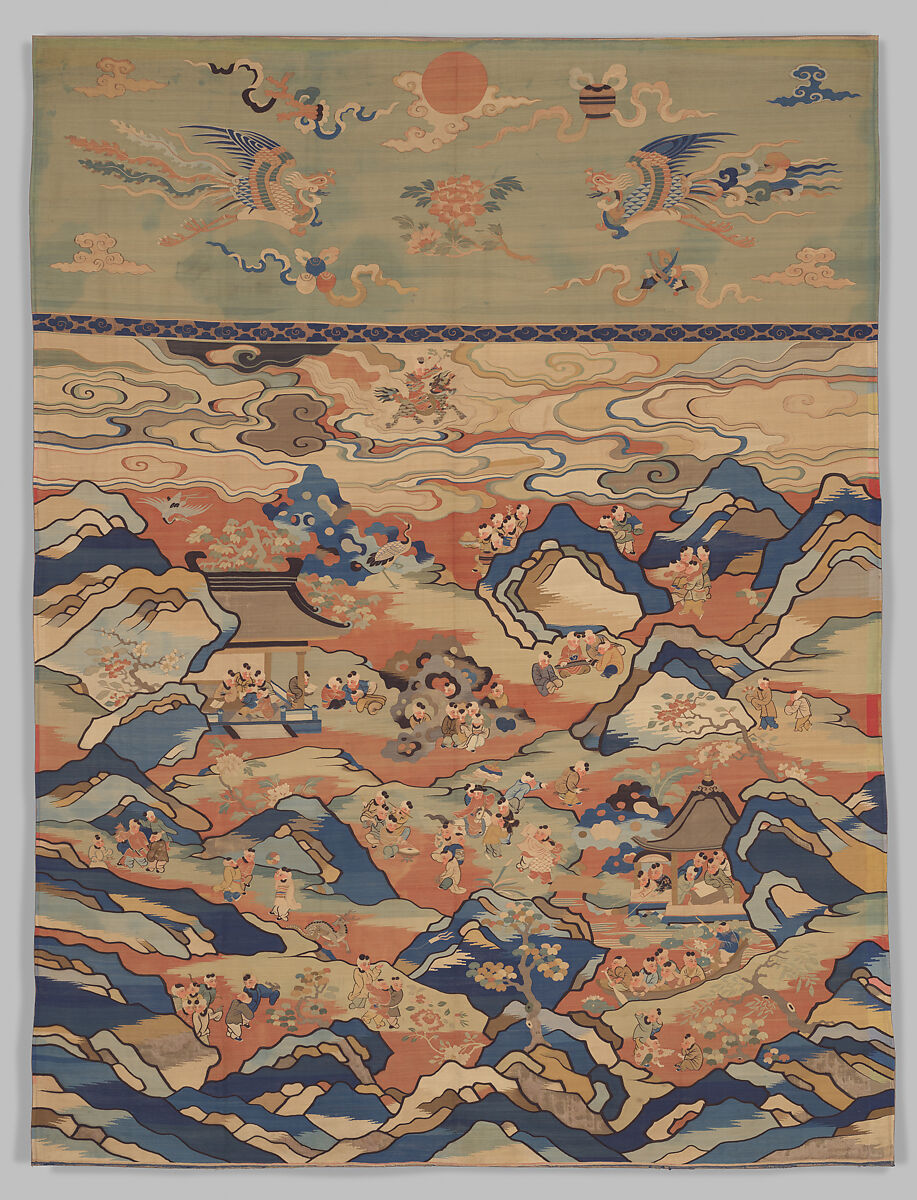This large polychrome silk tapestry features a motif called “the hundred boys,” an expanded version of children at play, to express the desire for a prosperous family. Little boys (eighty-three, to be exact) engage in various activities, such as archery, boating, falconry, fishing, horseback riding, kite flying, music making, playing with a ball, and reading. Each child is woven in a different posture with simple but fluid outlines, which required not only great skill but also an artistic sensibility. Panels like this usually served as wall decoration in elite houses.