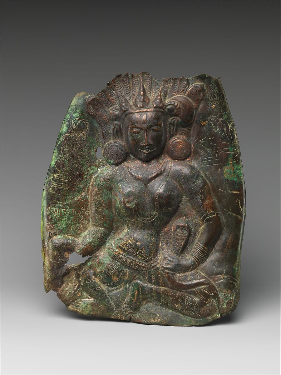 The goddess Manasa is seated in royal ease, displaying large circular ear-plug ornaments with engraved hamsa motifs, a torque, pearl necklace, and wears a patterned diaphanous waist cloth (dhoti); her armbands assume the form of an entwining snake. She is crowned with a three-pointed diadem and her hair, gathered in a bun, is offset to her left. Behind her head radiates the seven-headed canopy of the serpent naga, and in her lowered left hand she holds the body of a rearing snake. She gestures varadamudra with her right. Flanking Manasa at upper left is the engraved figure of a seated Hindu rishi, his hands raised in veneration, and upper right the figure of a male deity also seated in royal ease, most likely identified as Shiva by his piled-up hair (jatumukuta). Beneath the rishi appears four lines of an engraved inscription