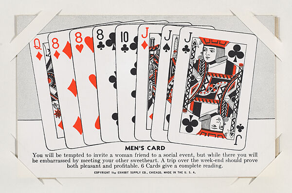 From Exhibit Playing Cards Poker Hands (W437). Distributed by Exhibit Supply Company. Dispensed in arcade machines. Postcard-sized thick card. White with red and black. Fortune/prediction printed at bottom. Printed across bottom: Copyright 1939 EXHIBIT SUPPLY CO., CHICAGO, MADE IN THE U. S. A.