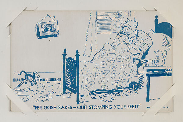 From Exhibit Comics Cards (W431). Dispensed in arcade machines. Postcard-sized thick card. Cartoons, "Fun Cards", Comics etc. Printed lower right: MADE IN U. S. A.