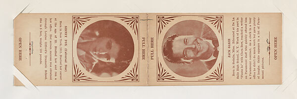 From Star Folders Special Cards (W439). Horoscope-Fortune backs. Sepia toned. Double-sided with an individual movie star's photo within circle on each side. Male on one side and female on other side connected by perforated fold. Short biography/statistics of each star below image. Instructions: OPEN HERE (at bottom) and PULL HERE (at top). Back includes "Your Fortune".