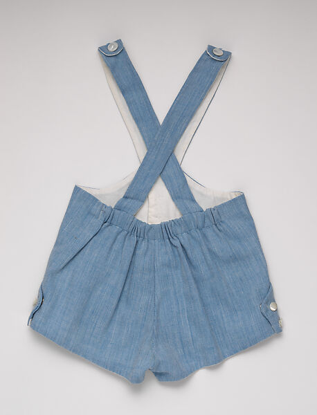James debuted his line of infants’ wear at his Salon in October 1956, modelled by his 8-month-old son, Charles Brega Haweis James, and a coterie of small, red, full-bellied mannequins. The clothes he showed were marked by graceful shaping, precise cut, and refined seaming, as seen in this infant’s playsuit. James considered all practicalities, designing this playsuit with curved, crossing straps, cut in one with the front panels, that fit to the body and stay in place, and with diaper-front shorts that open to lay flat for ease of ironing. Its curved fronts follow the lines of a child’s rounded belly, while accommodating and hiding the bumps of diapers. This attention to form, fit and functionality reflect James’s pursuit of perfection in all facets of his work.