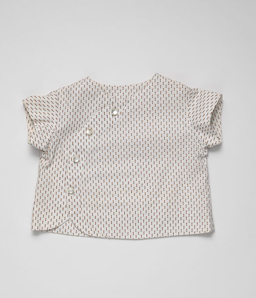 James debuted his line of infants’ wear at his Salon in October 1956, modelled by his 8-month-old son, Charles Brega Haweis James, and a coterie of small, red, full-bellied mannequins. The clothes he showed were marked by graceful shaping, precise cut, and refined seaming, as seen in this infant’s jacket. Its loose construction and wide armholes allow freedom of movement, while the curved front opening follows the lines of a child’s rounded belly. This attention to form, fit and functionality reflect James’s pursuit of perfection in all facets of his work.