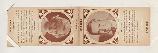 From Star Folders Special Cards (W439). Horoscope-Fortune backs. Sepia toned. Double-sided with an individual movie star's photo within circle on each side. Male on one side and female on other side connected by perforated fold. Short biography/statistics of each star below image. Instructions: OPEN HERE (at bottom) and PULL HERE (at top). Back includes "Your Fortune".