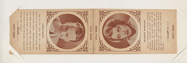 From Star Folders Special Cards (W439). Horoscope-Fortune backs. Sepia toned. Double-sided with an individual movie star's photo within circle on each side. Male on one side and female on other side connected by perforated fold. Short biography/statistics of each star below image. Instructions: OPEN HERE (at bottom) and PULL HERE (at top). Back includes "Your Fortune".