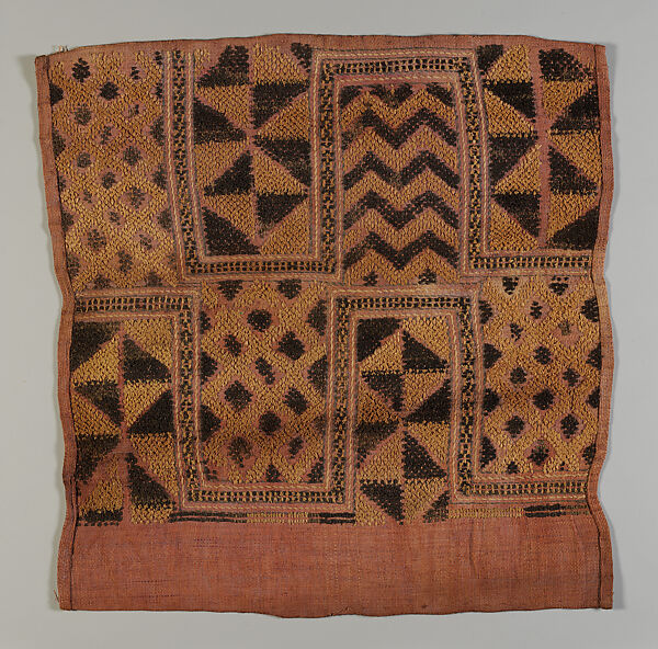 Cloths produced by Kuba artists are among a series of related central African textile traditions in which works are produced on a bark or raffia fiber structure. The production of central African textiles draws upon both male and female creativity: men act as weavers of cloths which women embroider and paint. Artists elaborate their patterns from memory. While abstract, patterns and design motifs may be given an evocative name whose meaning is significant to the wearer. Among the Kuba and related peoples, textiles are multifaceted objects of use and meaning. They are worn or displayed on ceremonial occasions as emblems of prestige, wealth and status. In the past, they were sometimes used as a form of currency. This series includes textiles that combine bold and imaginative approaches to design and refined mastery of technique.