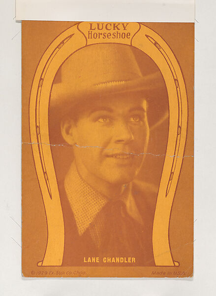 From 1929 Western Cowboys Exhibits Novelty Star Designs (W435). Distributed by Exhibit Supply Company. Dispensed in arcade machines. Postcard-sized thick card. One color. Double-sided. Reverse has corner coupon. One side is LUCKY Horseshoe with western star's picture -- the other a movie scene with different western star. Across bottom: ©1929 Ex. Sup. Co. Chgo. Made in U.S.A.