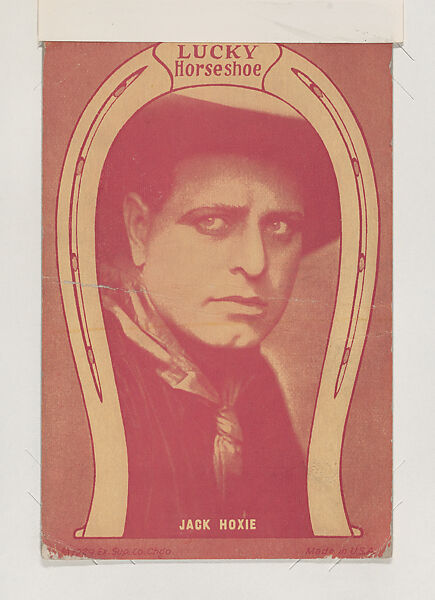 From 1929 Western Cowboys Exhibits Novelty Star Designs (W435). Distributed by Exhibit Supply Company. Dispensed in arcade machines. Postcard-sized thick card. One color. Double-sided. Reverse has corner coupon. One side is LUCKY Horseshoe with western star's picture -- the other a movie scene with different western star. Across bottom: ©1929 Ex. Sup. Co. Chgo. Made in U.S.A.