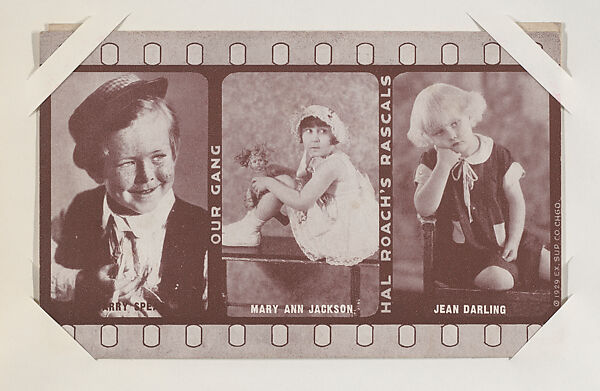 From Our Gang from Exhibit Arcade Cards (W435). Distributed by Exhibit Supply Company. Dispensed in arcade machines. Postcard-sized thick card. Brown/sepia and white "film" tri-image. Printed vertically: OUR GANG and HAL ROACH'S RASCALS. At edge: 1929 EX. SUP. CO. CHGO.