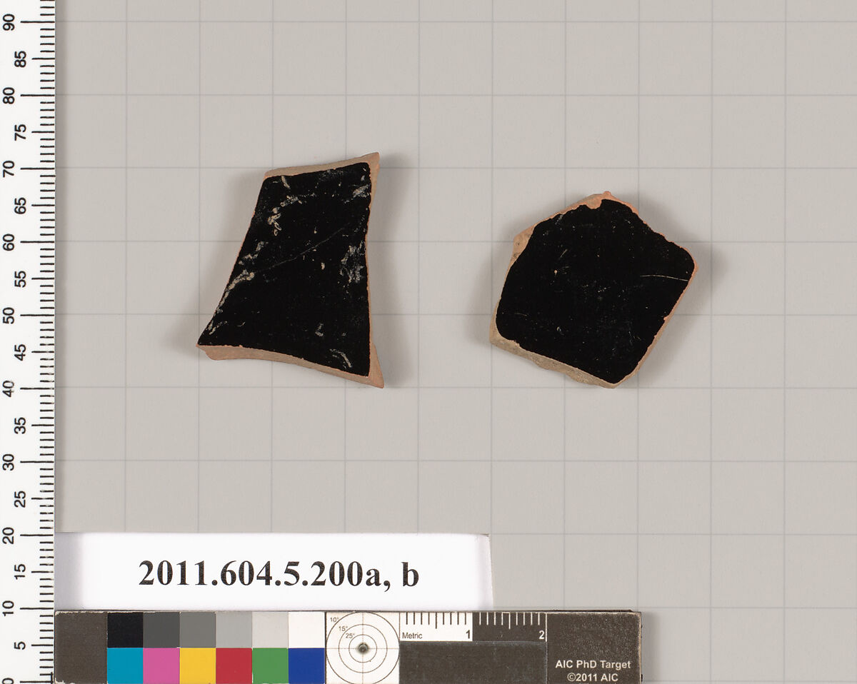 Two black glazed fragments from kylikes, each with the start of a handle root