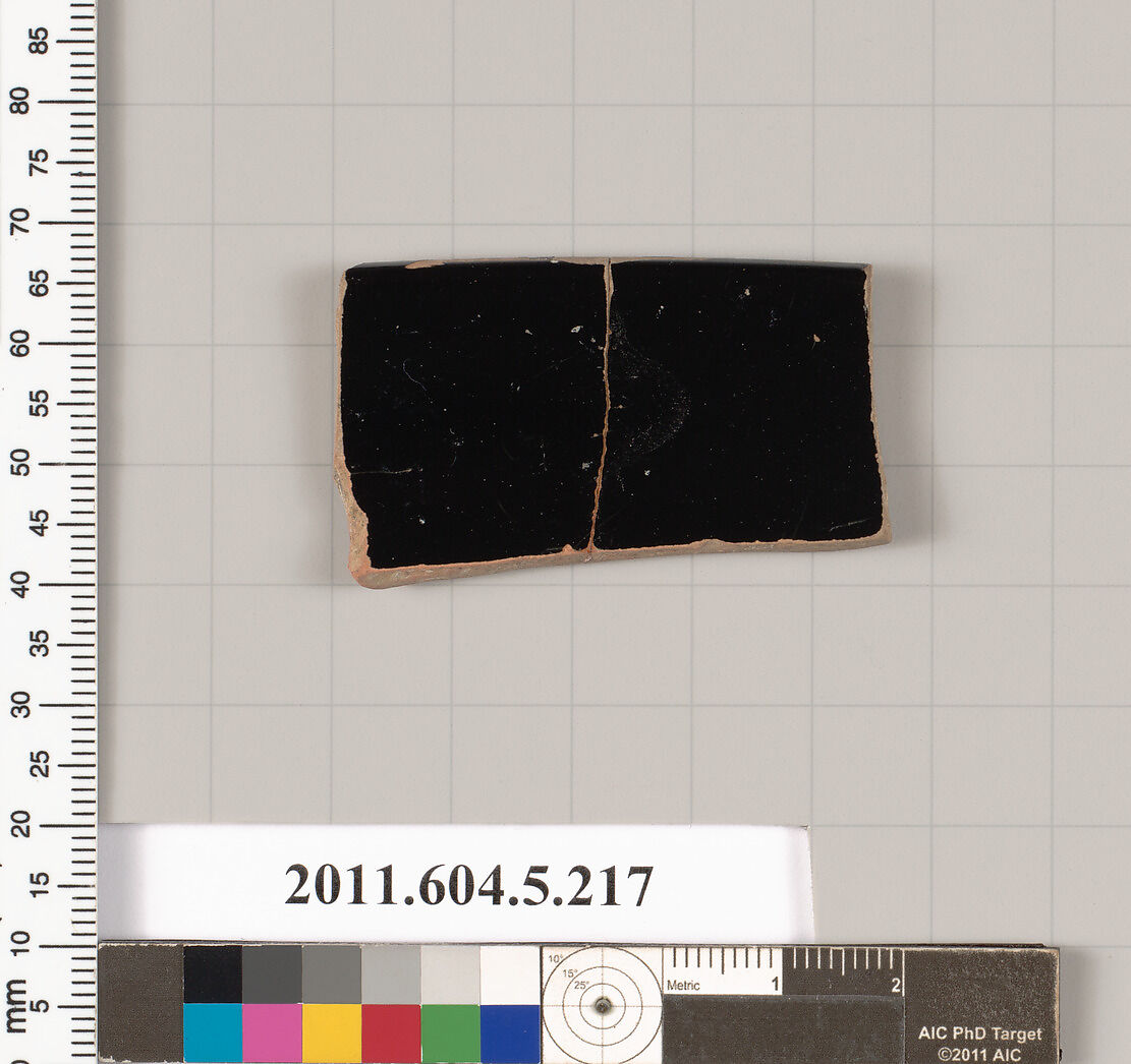 Exterior, black glazed rim fragment with a bit of the upper left corner of the handle patch