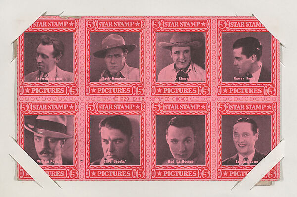 From Star Picture Stamps Exhibits Novelty Designs (W435). Distributed by Exhibit Supply Company. Dispensed in arcade machines. Postcard-sized thick card. Postcard back with coupon. The front of the card pictures each star in the format of eight stamps. Printed: STAR STAMP PICTURES. Printed at center: 1929 EXHIBIT SUPPLY CO CHICAGO.